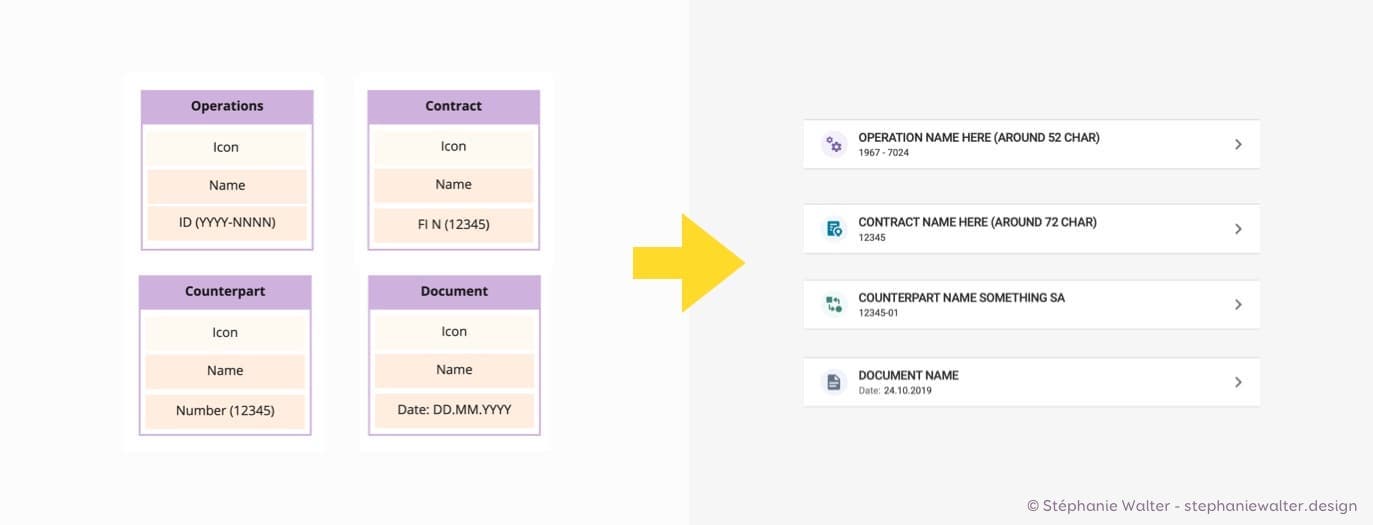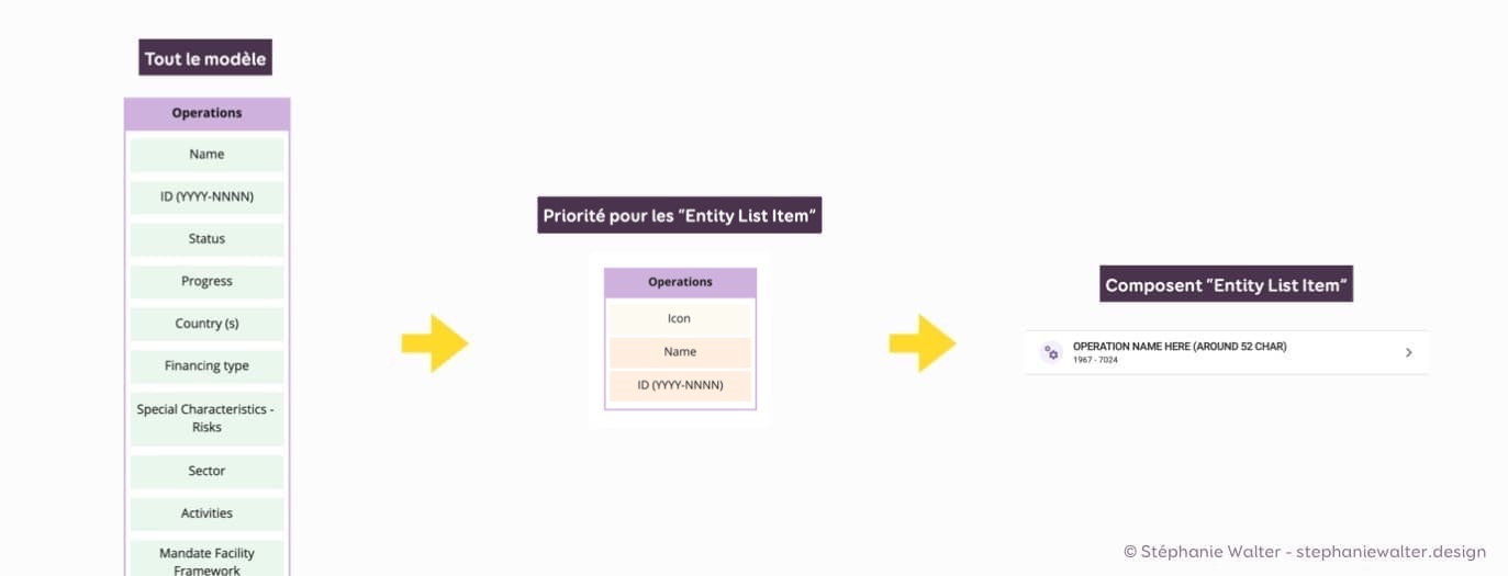 À partir de ma priorisation de contenus, je peux “garder” la partie du modèle de contenu qui va aider l’utilisatrice à décider de cliquer ou non sur cet élément (ici c’est la partie qui identifie l’opération) pour créer ce composant de liste / navigation qu’on appelle chez nous “entity list item”.