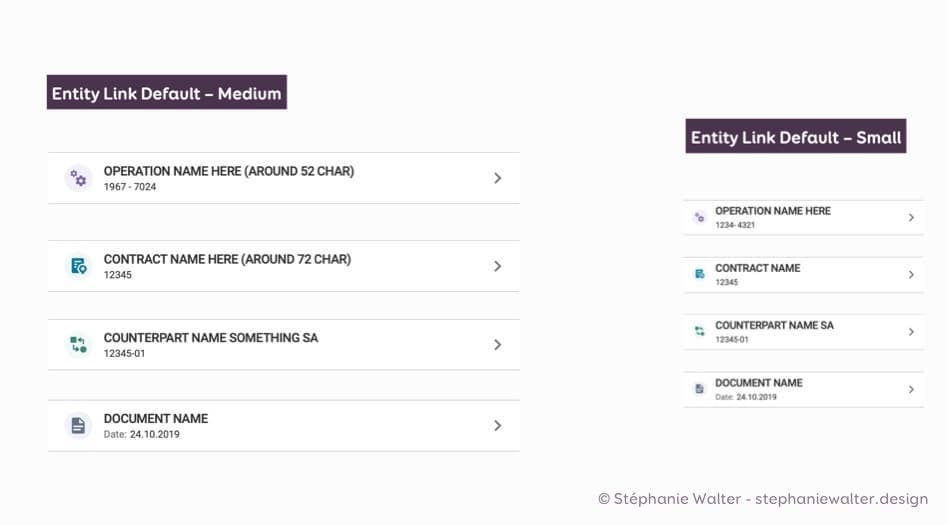Si je prends un exemple concret sur un projet un poil plus complexe que des sites de recette de cuisine… J’ai un site avec des opérations financières. Nous avons la page détaillée d’une opération. Mais nous avons aussi besoin de composants de “navigation” qu’on appelle “entity link item” qui permettra de lister les opérations à différents endroits de l’interface. Le modèle de contenu de l’opération est très compliqué, car il va contenir beaucoup d’éléments. Tellement compliqué qu’au final, on va structurer et répartir ces attributs de contenus en “sous types” sur plusieurs pages de détails.