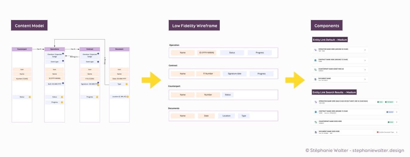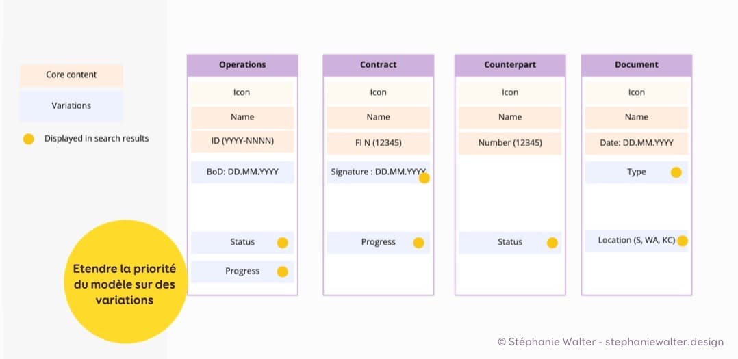Je suis une grande fan du livre de Abby Covert “How to make sense of any mess”. En général, face à un problème compliqué, je commence par le découper en petits morceaux et tout mettre à plat. Dans mon métier on appelle ça « travailler l’architecture d’information ». Et pour des composants, ces petits morceaux sont souvent les différents types de contenus et de contenus dont je vais avoir besoin. Avant de designer le moindre composant, je commence donc par modéliser les types de contenus dont je vais avoir besoin dans l’interface au niveau des pages et de mes composants.