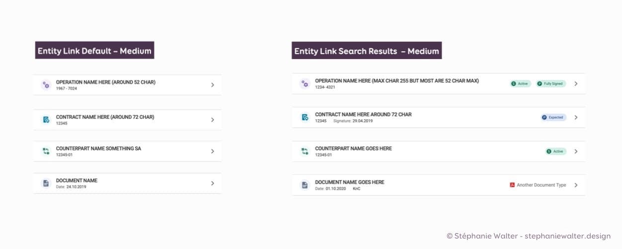 Mon composant “entity link” pourrait être réutilisé pour la page de résultats de recherche. Mais nous nous sommes rendu compte qu’en termes de priorité utilisateur, pour les résultats de recherche, il nous fallait afficher un peu plus d’informations que la version par défaut. C’est lié au fait que ce composant dans les résultats de recherche peut être filtré. Il nous faut donc un peu plus d’informations.