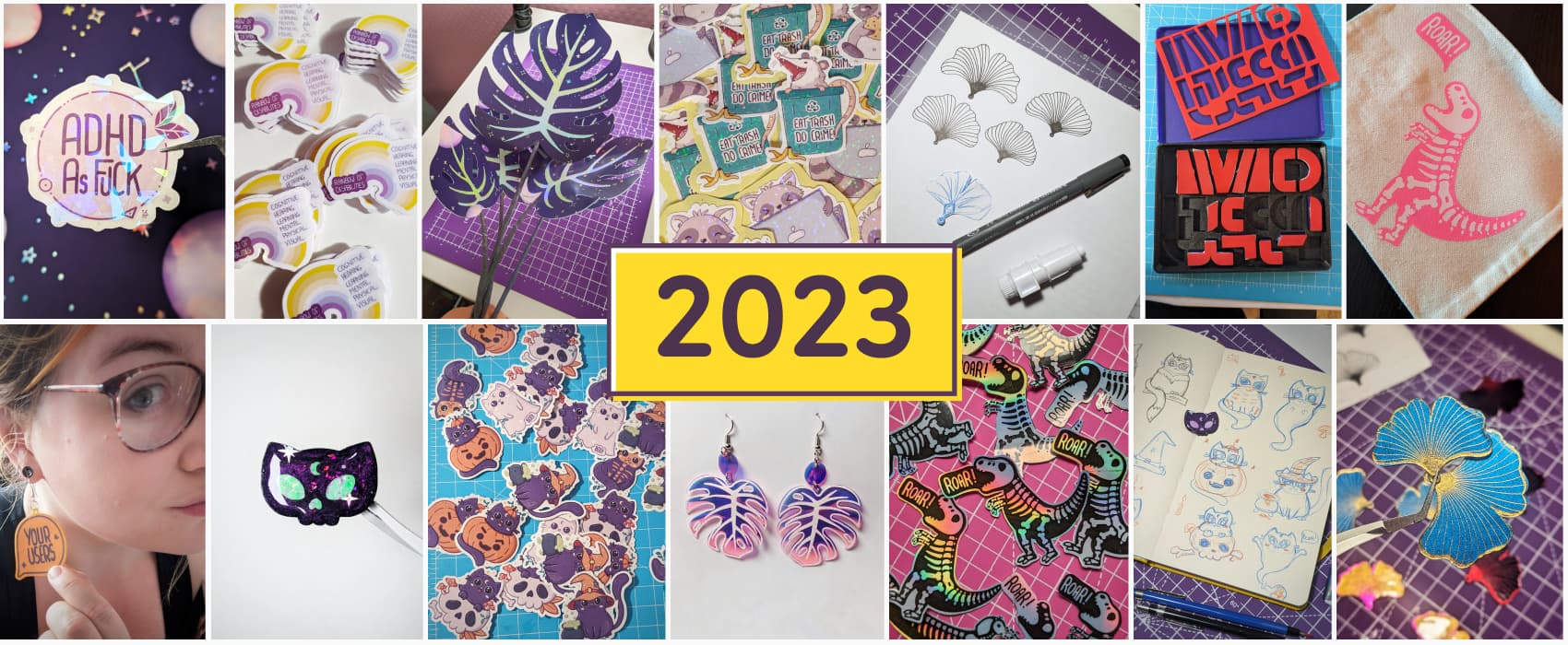 And of course, since I finally found a decent way to get some shiny stickers, holographic and glitter ones, I had to make stickers. I also designed a new one middle of the year: the “be cute, do crime” capybara. Since I don’t like to waste paper, I’ve also created some “fillers”: small stickers that I can sneak into a batch. That batch got a few sunrise witchy ones that I usually offer to people.