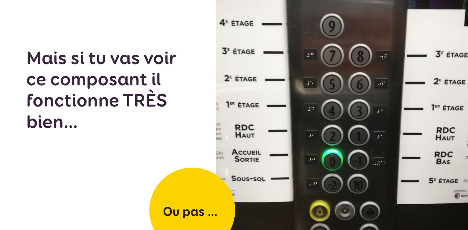 Ici on a un immeuble de 5 étages et un composant ascenseur de 9 étages. Le composant a été utilisé malgré le fait qu’il ne correspondait clairement pas au besoin. Les étages ont été redirigés et dupliqués, il faut faire le 5 ou le 6 pour accéder au 2 e étage, le 10 pour le 5e. ça n’a plus aucun sens. Bonne chance au passage pour les utilisatrices aveugles. Le plus drôle dans cette histoire ? On m’a fait remarquer qu’il s’agit de l’ascenseur des Gobelins, école de design…