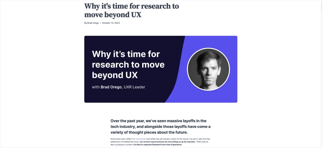 Why it’s time for research to move beyond UX (10min) a refreshing approach, different from the whole “UX designers don’t know how to prove their value”: our current org structures are not setting us up for success, and we need to change that. YES! By Brad Orego