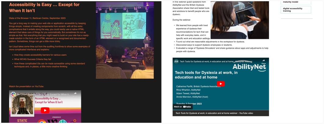 - Tech Tools for Dyslexia at work, in education and at home: great tips and list of tools to help you (or someone you know) with dyslexia, a review of dyslexia simulators (be careful those might be misleading) and a great panel to help you understand the different issues people with dyslexia might encounter on the web and in their workplace