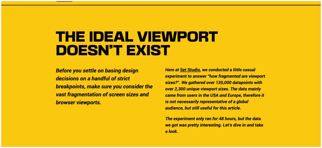 The ideal viewport doesn’t exist: you can’t make design decisions based on user’s viewport, instead, go beyond, structure your content, make sure it works at different sizes, with different user conditions, etc.