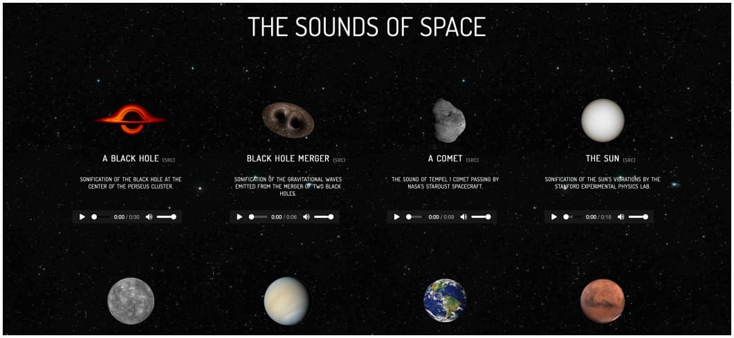 Sounds of Space: Hear the Music of the Universe: sonification of different celestial objects and phenomena in the universe