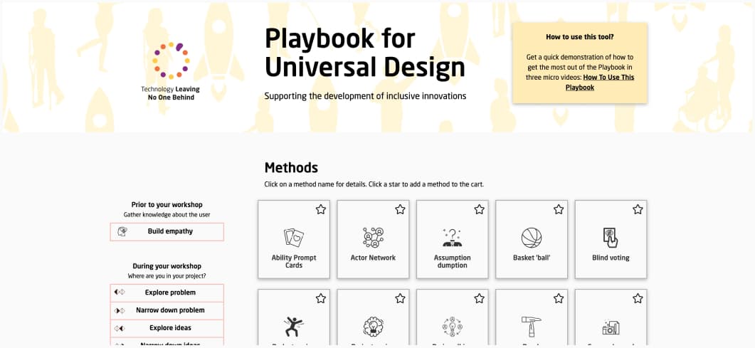 Playbook for universal design: a great place to find tools, methods, frameworks to include in your design process to build more inclusive and universal products and services. The methods can be filtered by phases of the design process (double diamond), types (warm ups, create ideas, etc.). This also comes with tips to facilitate workshops and a set of “ability prompts” to help understand the impact of different disabilities when you design. Created by DTU Skylab