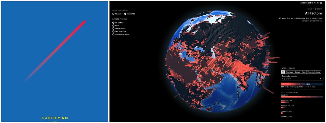 - Mapping where the earth will become uninhabitable: 3D interactive visualisation that show where populations are projected to be hit the hardest by the climate crisis (lethal heat, flooded coastlines, powerful hurricanes, water scarcity)