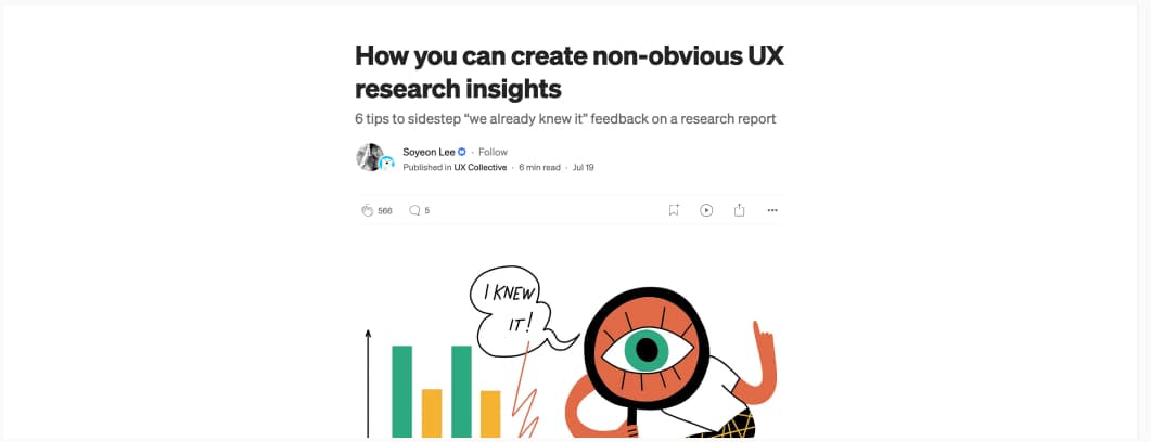 How you can create non-obvious UX research insights (7min) 6 tips to avoid the “yes we already knew that” when presenting UX research reports: start with stakeholder interviews to clarify what they already (think they) know, combine methods, include extreme users when recruiting, build aha moments, present the findings in a narrative, and remember that it’s normal they feel that way too due to the hindsight bias (by Soyeon Lee)