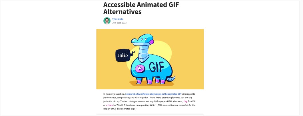 Accessible Animated GIF Alternatives: using the video element to put looping “GIFs” that visitors can control, don’t autoplay when user as reduced motion on, and have a text alternative.
