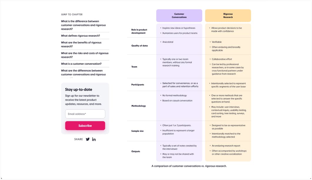 What separates rigorous research from customer conversations? The distinction between both is very important, because a lot of people will have conversation and try to convince it’s research, basing design decisions on biased data. What are the risks and costs of each mode of learning, plus learn when and how to use each one effectively.