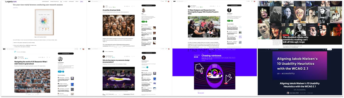 - 10 Ways Designers and Researchers Can Meaningfully Engage With Disabled People: involve them from the beginning, design against (ableism) instead of for or with disability, think about power dynamics, stop ignoring invisibilized disabilities, think about accessibility in terms of time and energy (not just space and matter), offer remote and asynchronous facilitation, be deliberate about how you categorize disability, reach to people who are often left out, make design process mutually beneficial, stop relying on traditional networking to reach out to disabled people