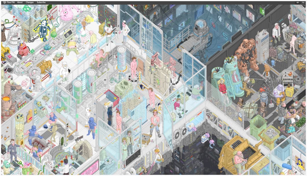 Floor796: Floor796: an ever-expanding animation scene showing the life of the 796th floor of the huge space station, full of pop culture reference. What an awesome eye candy. Don’t forget to click on the little characters to get some references (trigger warning: giant animation that might trigger motion sickness)