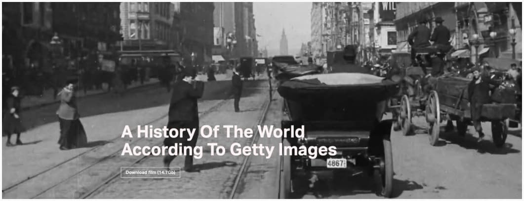 A History Of The World According To Getty Images: a documentary on human history, created with images from Getty Images catalog. Getty Images owns the rights of a lot of images, including historic ones. These images live in our heads and form a part of our collective memory. But in most cases, we cannot access them, as they are held captive behind Getty’s (as well as many other archives’) paywalls. The film explores how image banks including Getty gain control over, and then restrict access to, archive images – even when these images are legally in the public domain.