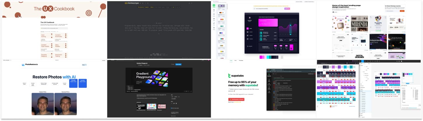 - Landing Gallery: a place to discover beautiful hand-picked landing pages for your inspiration, from homepage to pricing page, about, sign up, 404, etc.