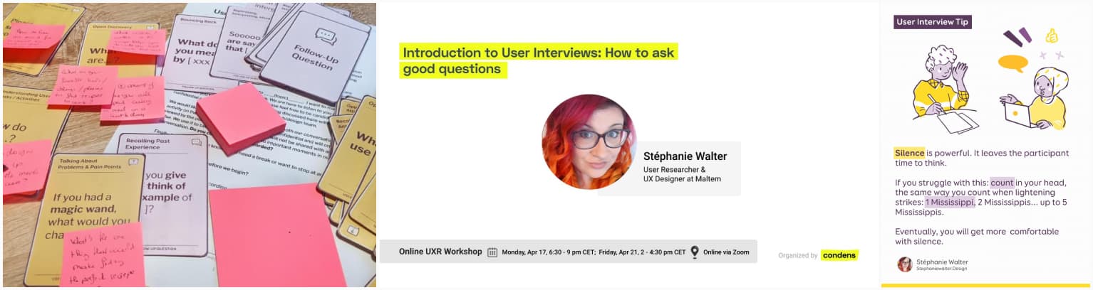 Fun interview tip today: silence is powerful, it gives the participant time to think. But, silence is hard. Humans do not like silence. If you struggle with this, my fun advice: count in your head, the same way you count when lightening strikes: 1 Mississippi, 2 Mississippis… up to 5 Mississippis. Eventually, you will get more comfortable with silence. I made a small visual to illustrate that. For more interview tips, check My expert guide to user interviews.