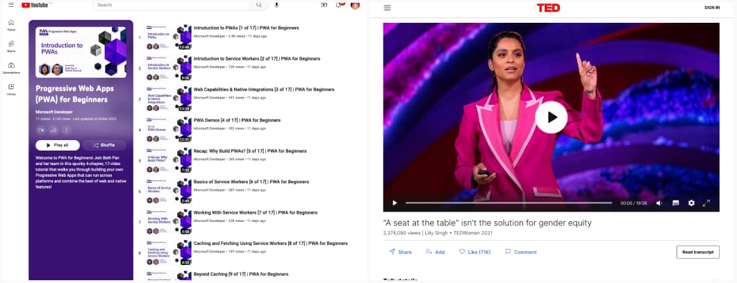 - Introduction to PWAs is a nice YouTube playlist of free videos to help beginners learn and build PWAs, created by Microsoft