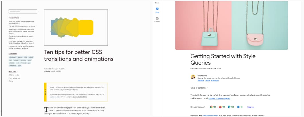 - Getting Started with Style Queries: we can style components based on parent size, but also based on any parent custom property. You can see this as a sort of conditional CSS.