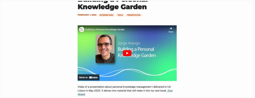 Building a Personal Knowledge Garden, a great talk by Jorge Arango on the tools we used to use through history and those used today to help us deal with the amount of information around us