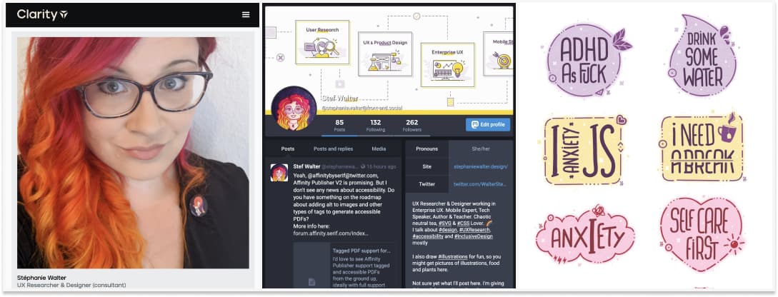 This Friday I spoke at and remotely attended Clarity. I spoke about how designers can document accessibility. I also drew some stickers for my friend Myriam, including some ADHD As Fuck, I *Anxiety* JS, Anxiety, Drink Some Water, I Need a Break, Self Care First.