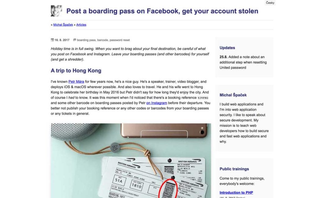Post a boarding pass on Facebook, get your account stolen, ou pourquoi il vaut mieux ne jamais rien poster avec un code barre