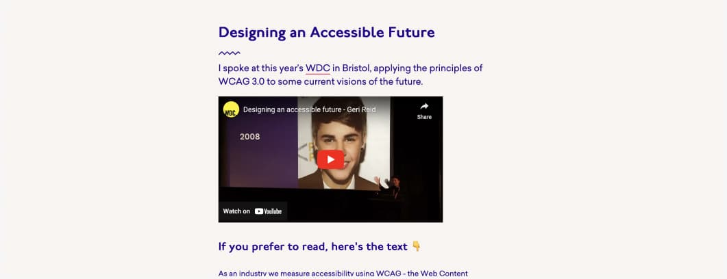 Designing an Accessible Future – very interesting talk (with text transcript) by Geri Reid about designing an accessible future, covering WCAG 3.0 but also Web3 (spoiler alert it’s not as inclusive as you might think), no screen interfaces, etc.