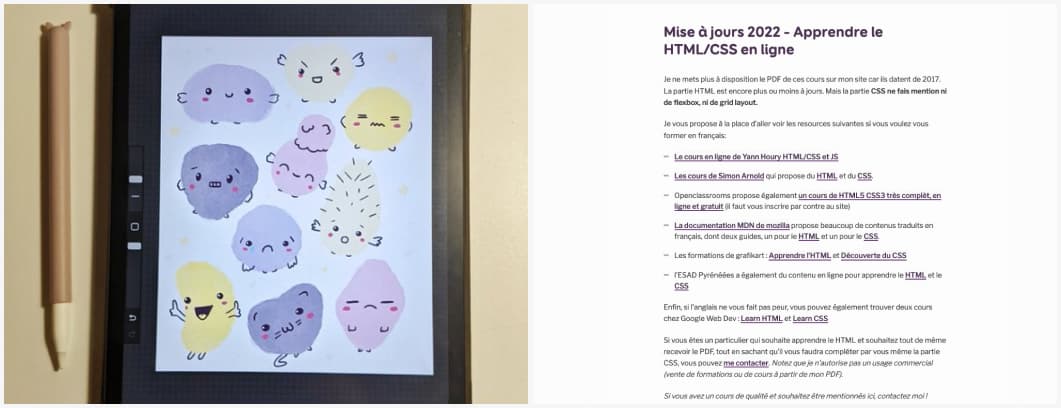 If you speak French: I used to share an “introduction to HTML/CSS” PDF. But it’s 5 years old now, a little bit outdated, so I removed the PDF. Instead, I put some links to nice French and English places to learn HTML and CSS.