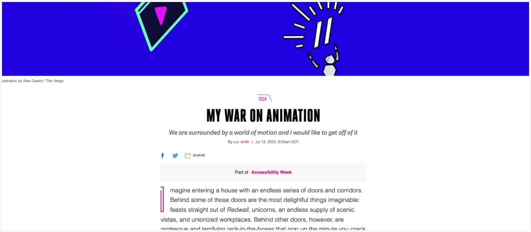 “My war on animation“, we are surrounded by a world of motion and I would like to get off of it” interesting article on animations, how they can trigger different issues for some people and the ableist answer we often get when expressing it. I once had someone make fun of me for telling him that his flip card animations made me nauseous. “This sounds exaggerated and I don’t believe it” is sadly a reply I often get too when talking about vestibular disorders. Major issue for me is video games. I’m never sure if I will be able to play them. Watching a YouTube video of someone else playing is not the same. I love video games who offer a demo, so that I can test the engine and depth of field for myself. If you want to dig further on the topic I have more information on UX and accessibility here.