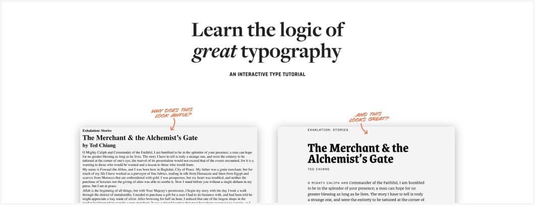 I don’t fully agree with the fond choices here, but it’s still a nice interactive exercise to understand different areas of typography choice: Interactive Typography Tutorial