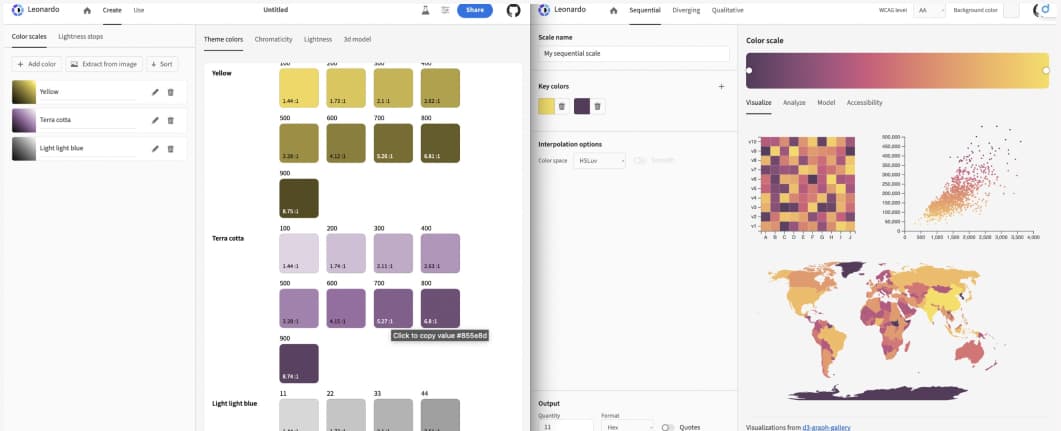 Leonardo color offers 2 tools I really like: a color palette builder that lets you know which color can be used with white or black text and a color scale mostly used for dataviz. They also have a whole article to help you understand how it works.