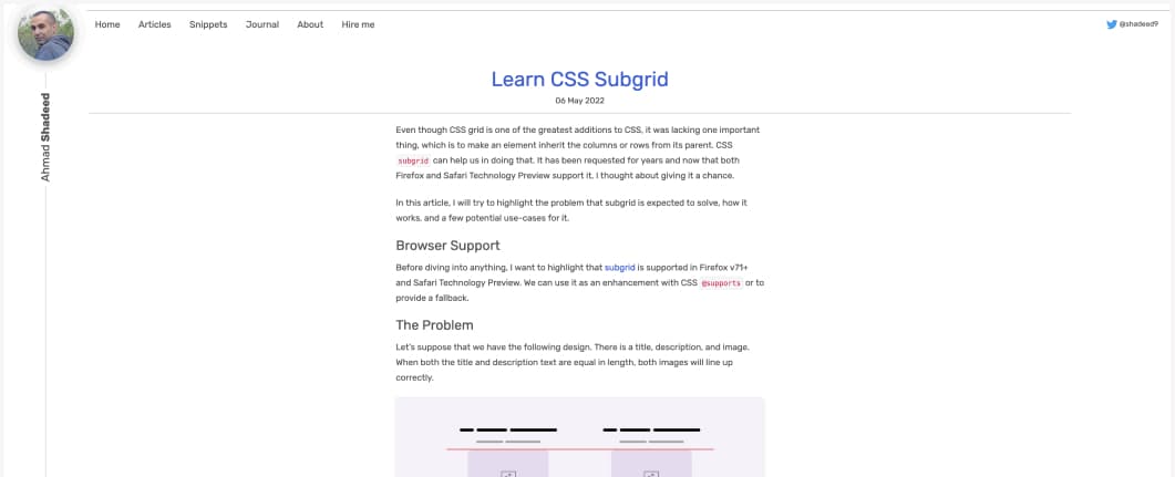 A great introduction to how to use CSS Subgrid to inherit columns and rows from its parent, by @shadeed9