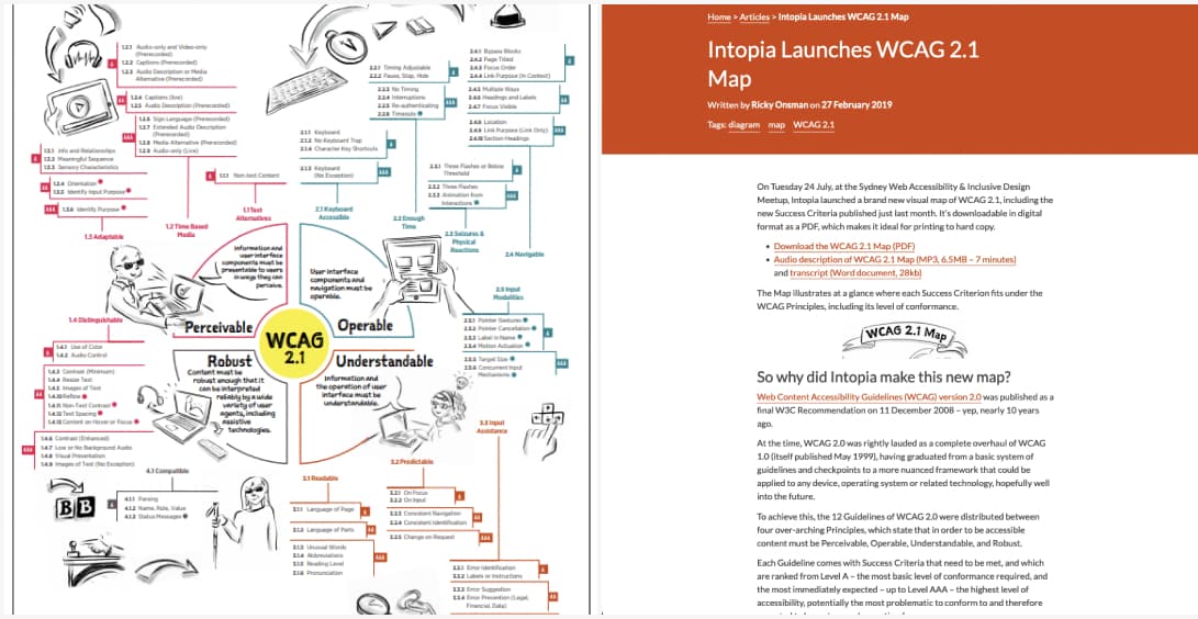 Here is a beautiful map to help you understand the different aspects of WCAG 2.1: perceivable, operable, robust and understandable. And you can also find audio descriptions of the map on @intopia