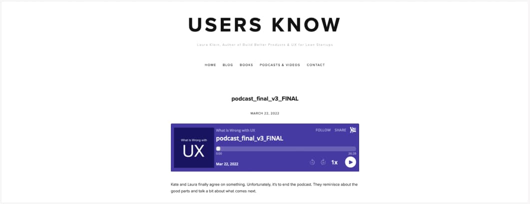 This is the last episode of What is Wrong with UX, a podcast about product design by Laura Klein and Kate Rutter. I’m a little bit sad. As one of those UX team of One those days, this was my favorite podcast: honest and fun, with real non fluffy bs content. I loved the synergy of those 2 discussing. But, yeah life goes on and I’m looking forward to Laura’s new podcast on recruitment, this should be fun too.