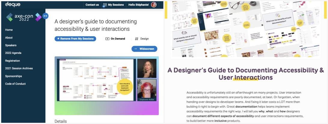 This week, I presented a talk at axecon. The written version of that talk is available on my blog: A Designer’s Guide to Documenting Accessibility & User Interactions. The feedback were amazing, and I want to thank you all again for the kind words. For now, you can watch the replay of my talk page once you logged in until April.