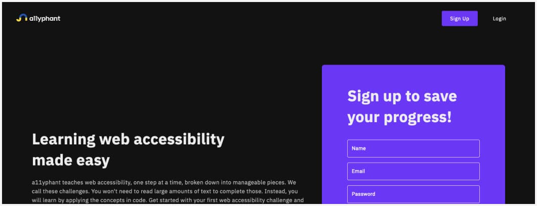 a11yphant.com, a place to learn the basics of web accessibility with explanation and small code exercises and quizes to test your knowledge