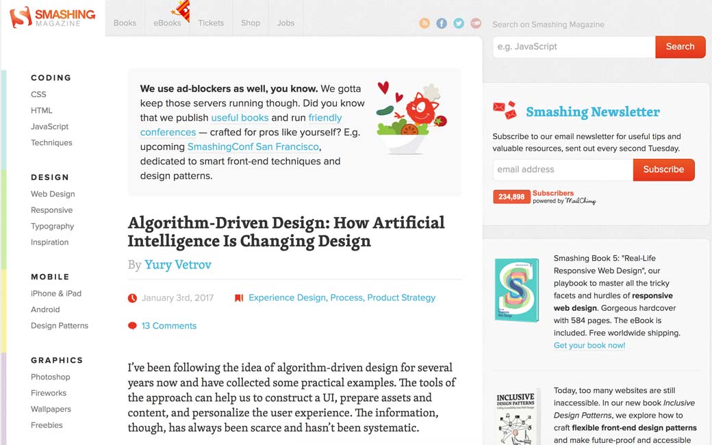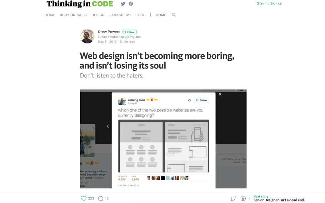 Web design isn’t becoming more boring, and isn’t losing its soul – le design des sites n’est pas devenu plus chiant, ils ont juste évolué, critiquer un site fonctionnel parce qu’il n’est pas fun est un peu comme critiquer un panneau routier pour son manque d’originalité