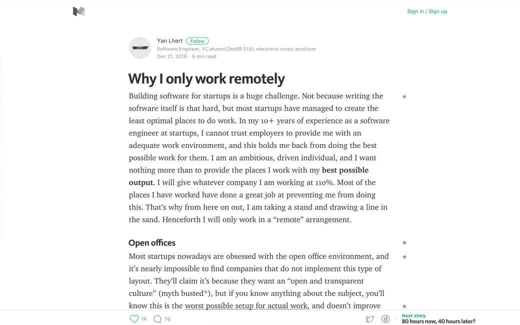 Why I only work remotely. C’est intéressant mais je me demande si c’est possible dans des équipes de créa ou on veut souvent que tu sois sur place pour t’avoir sous la main dans les phases d’idéation