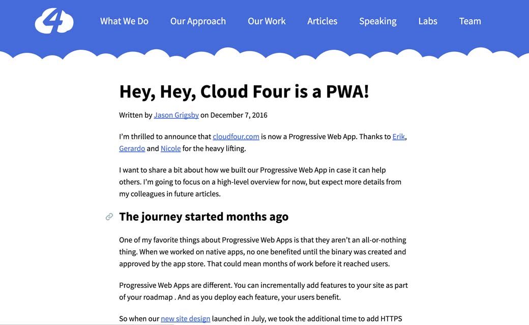 Ou comment cloudfour a été transformé en Progressive Web App, avec du support offline, des notifications, etc.