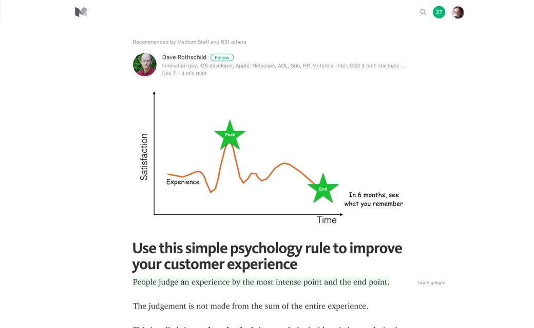 Use this simple psychology rule to improve your customer experience, les utilisateurs se souviennent de la fin d’une expérience et de la partie la plus intense.
