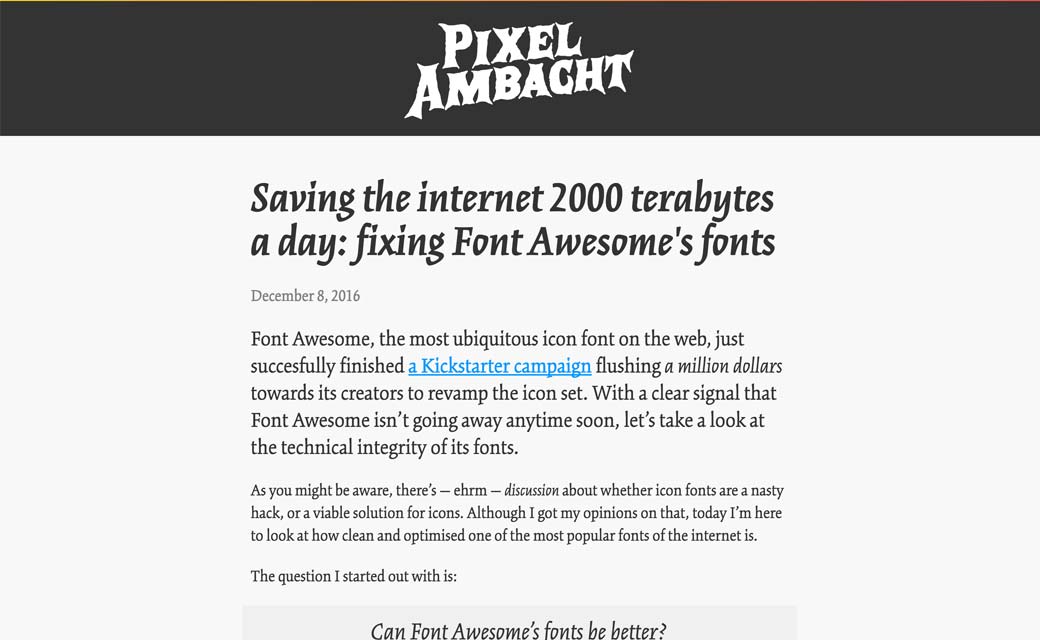 Saving the internet 2000 terabytes a day: fixing Font Awesome’s fonts, gagner de précieux Mega en réduisant le poids de Font Awesome, lisez également les commentaires très pertinents en bas de l’article