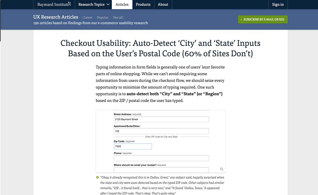Checkout Usability: Auto-Detect ‘City’ and ‘State’ Inputs Based on the User’s Postal Code (60% of Sites Don’t) auto-détecter le ville en se basant sur le code postale de l’utilisateur, beaucoup de sites ne le font pas