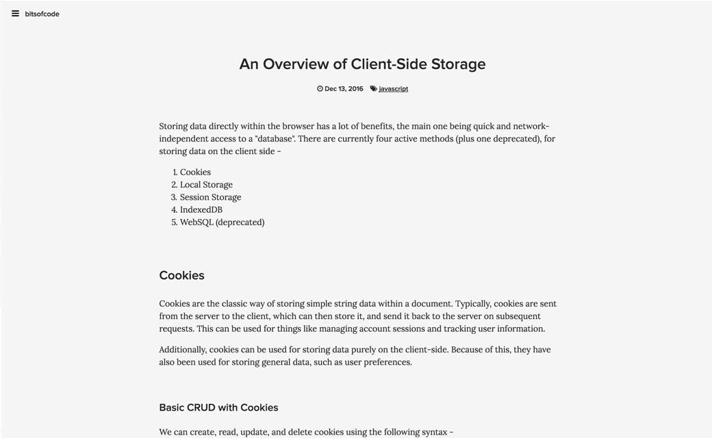 An Overview of Client-Side Storage, article très bien détaillé sur le type de stockage que l’on peut utiliser dans le navigateur