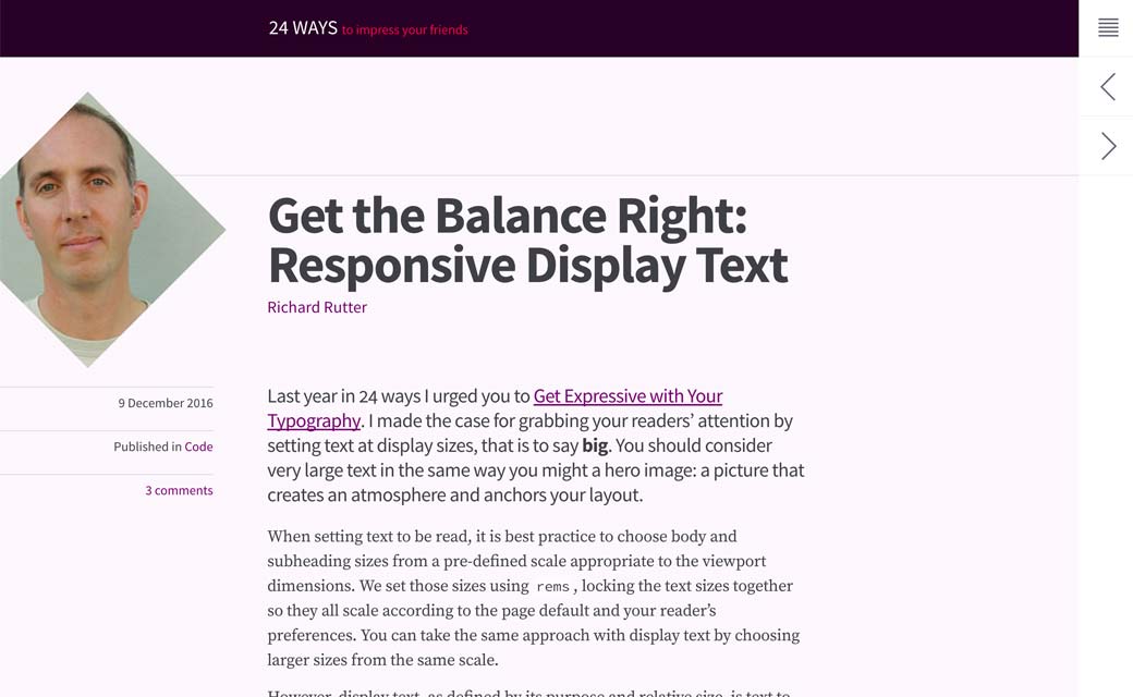 Get the Balance Right: Responsive Display Text. De la typographie responsive avec des viewport units. Intéressant mais je me demande si agrandir autant la typographie sur un très grand écran est une bonne idée niveau lisibilité.