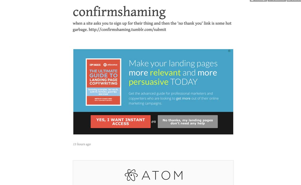 Confirmshaming.tumblr.com quand les marketeux deviennent inventifs sur les call to action lorsque l’utilisateur quitter la page