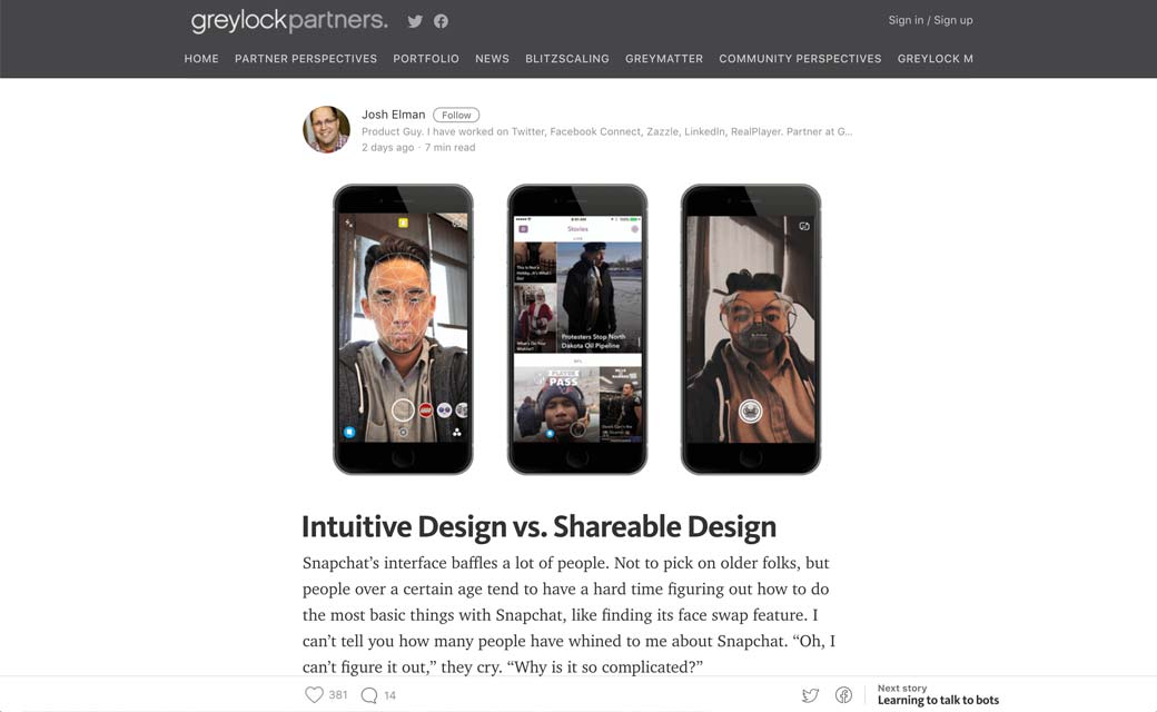 Intuitive Design vs. Shareable Design, donc en fait le design incompréhensible de Snapchat est voulu pour encourager les utilisateurs à partager son fonctionnement