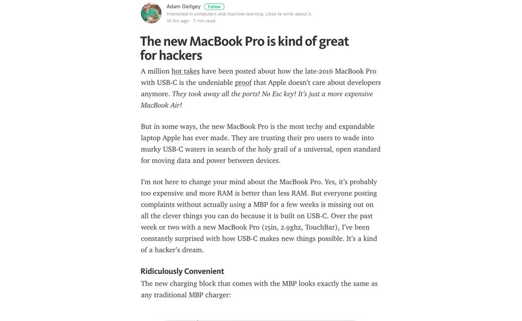 The new MacBook Pro is kind of great for hackers, pas mal de gens râlent sur le nouveau macbook avec uniquement du port USB-C, mais au final sur le long terme on va pouvoir faire pas mal de choses avec.
