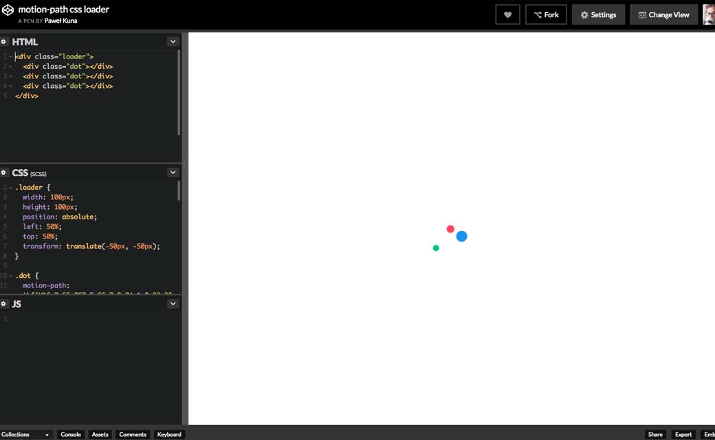 Motion Path CSS loader un loader CSS fait à partir de plusieurs éléments animés en suivant un chemin (supporté sur Chrome et Opera)