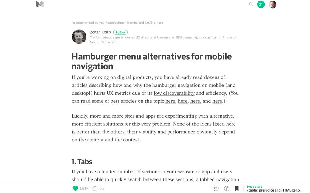 Hamburger menu alternatives for mobile navigation, des alternatives au burger menu. Au final pour moi la dropdown c’est un peu comme un burger menu sans l’icône mais on garde le fait de masquer une partie du menu par défaut