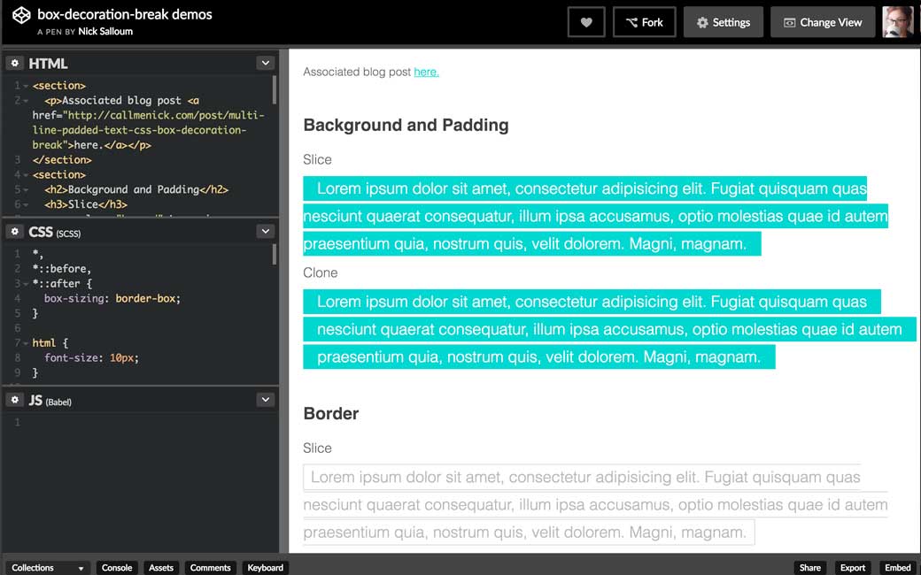 box-decoration-break demos, une demo de texte avec un arrière plan qui passe sur deux lignes