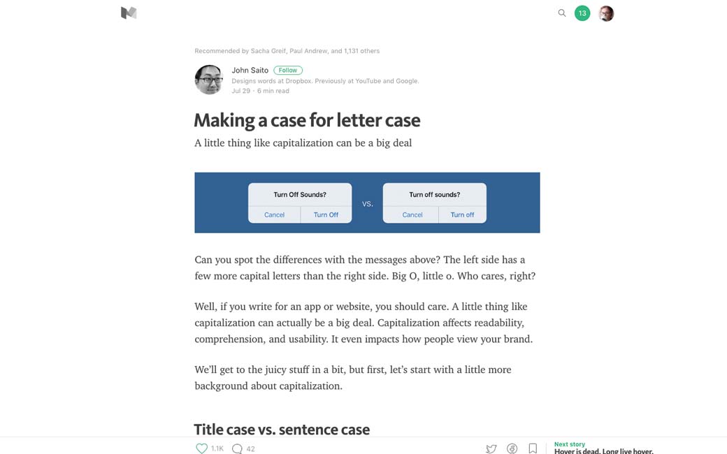 Making a case for letter case. utiliser des majuscules en début de chaque mot pour accentuer les titres dans les interfaces ou pas, un article intéressant (pas sûre que ça s’applique au français par contre)